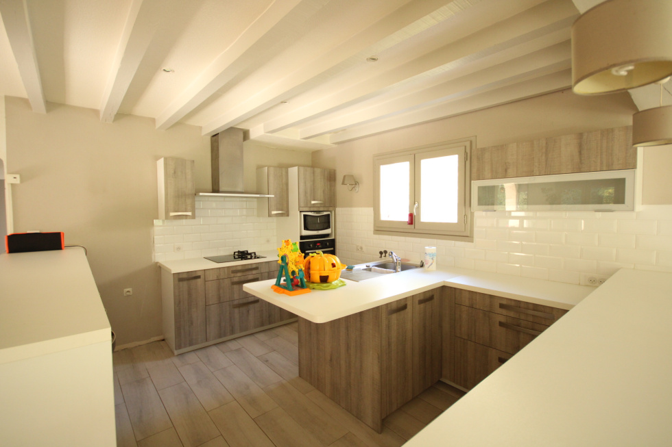 Le rdc réunit : l’espace de vie (sur un total de 60m²), cheminée à insert double foyer, une salle à manger et une cuisine ouverte entièrement équipée. Trois chambres, une salle de bains et toilettes complètent ce niveau.