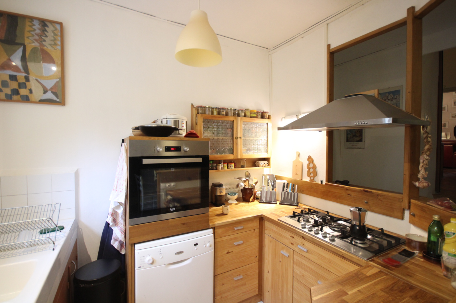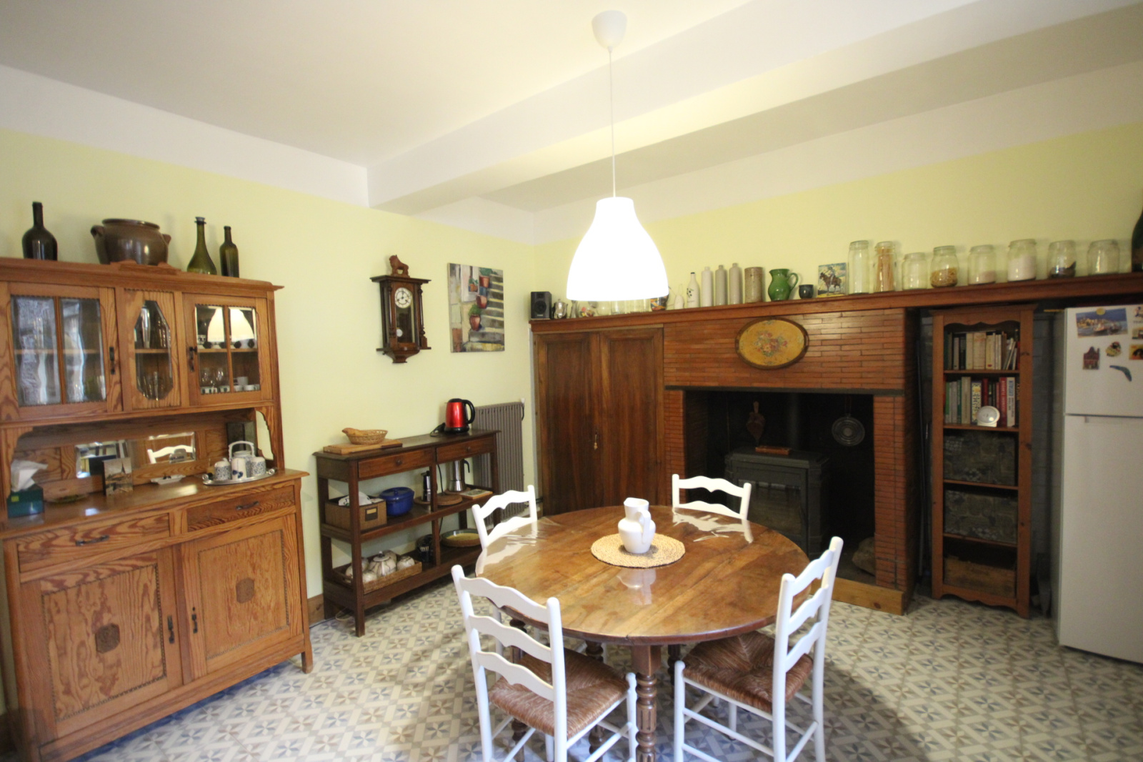 ½ niveau : une cuisine aménagée avec poêle à bois, salle de bains, toilettes.