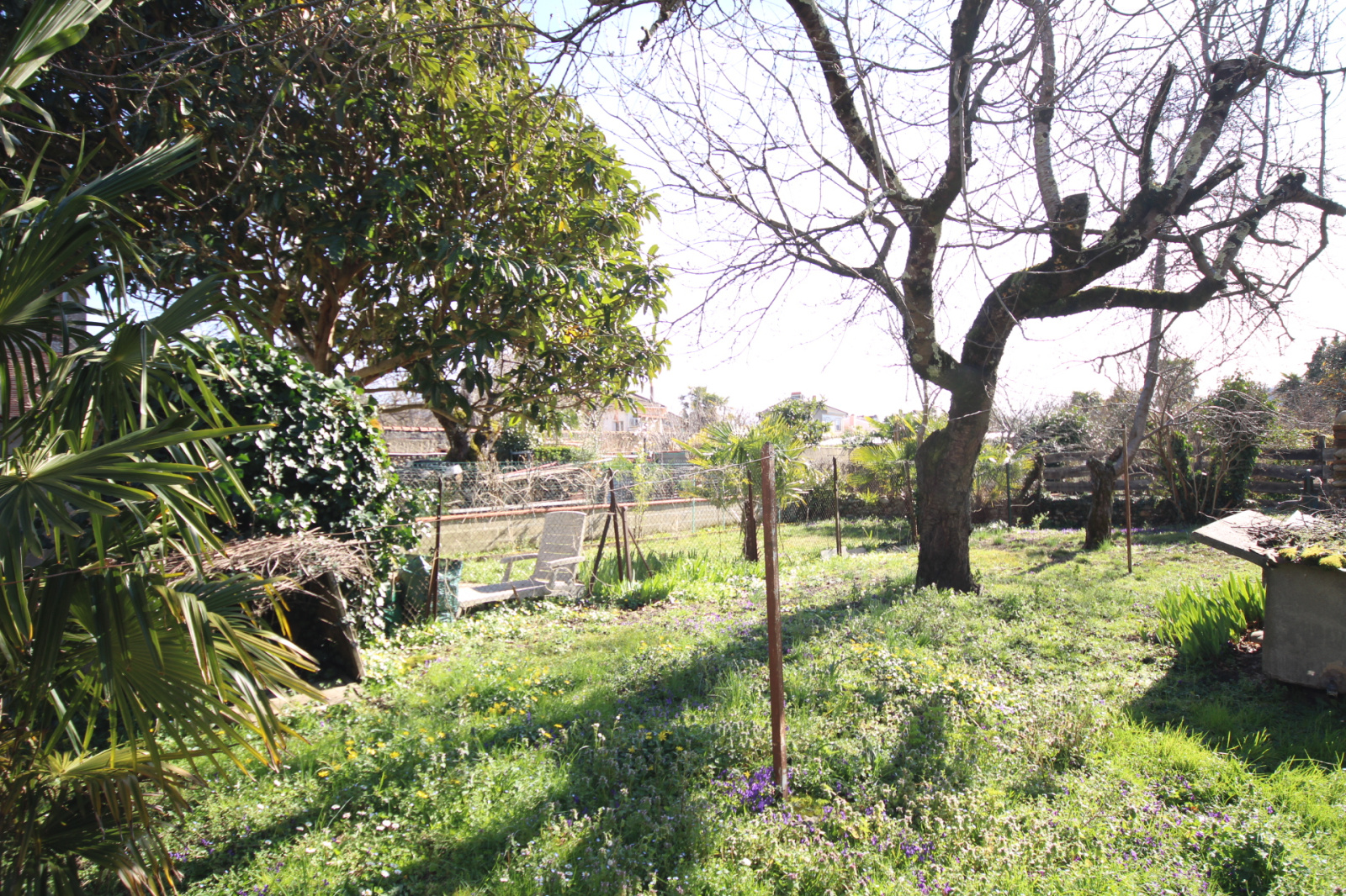 Jardin d’exposition Sud bordé de terrain voisin et de maisons.