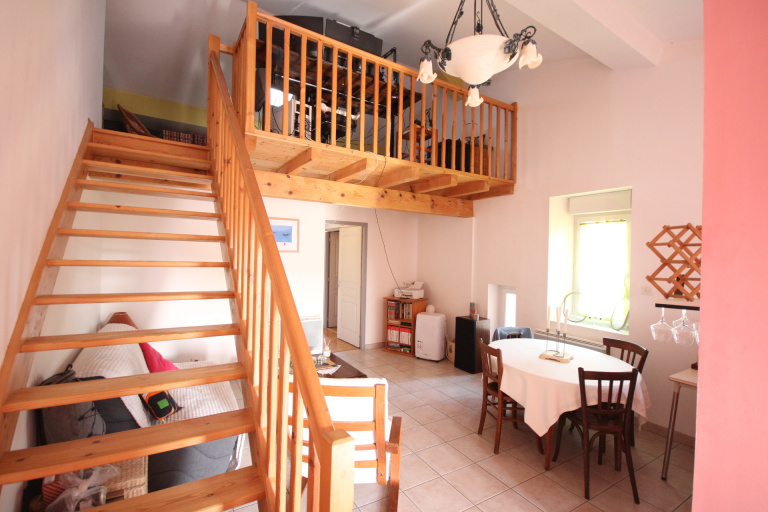 A l’étage, 2e appartement : entrée, cellier, cuisine équipée 6,77 m², séjour-salon 24,90 m², mezzanine 10m² (plus surface sous pente), une chambre de 14,30 m²,