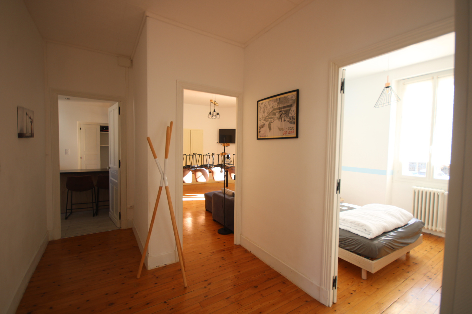 En second niveau (Rez-de-jardin) : un bel appartement privé de 88 m² comprenant un salon/cheminée, cuisine, 3 chambres (dont une chambre/bureau) et une salle d’eau.