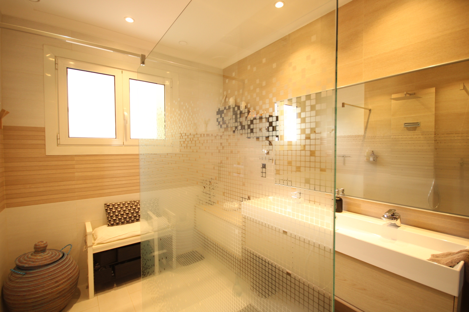 RDC : Hall d’entrée, 1 appartement avec salon/salle à manger/cuisine équipée donnant sur la piscine et accès terrasse, 1 chambre, 1 salle d’eau, toilettes, 1 espace bureau ou salle de sport.
