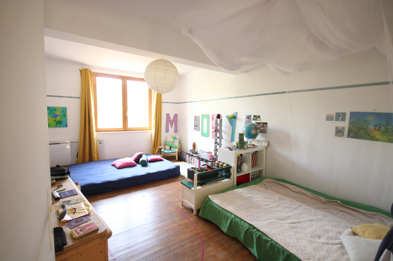 Au premier étage : 2 grandes chambres, 1 bureau avec une sortie sur l'extérieur côté jardin, 1 salle de bains et un toilette.