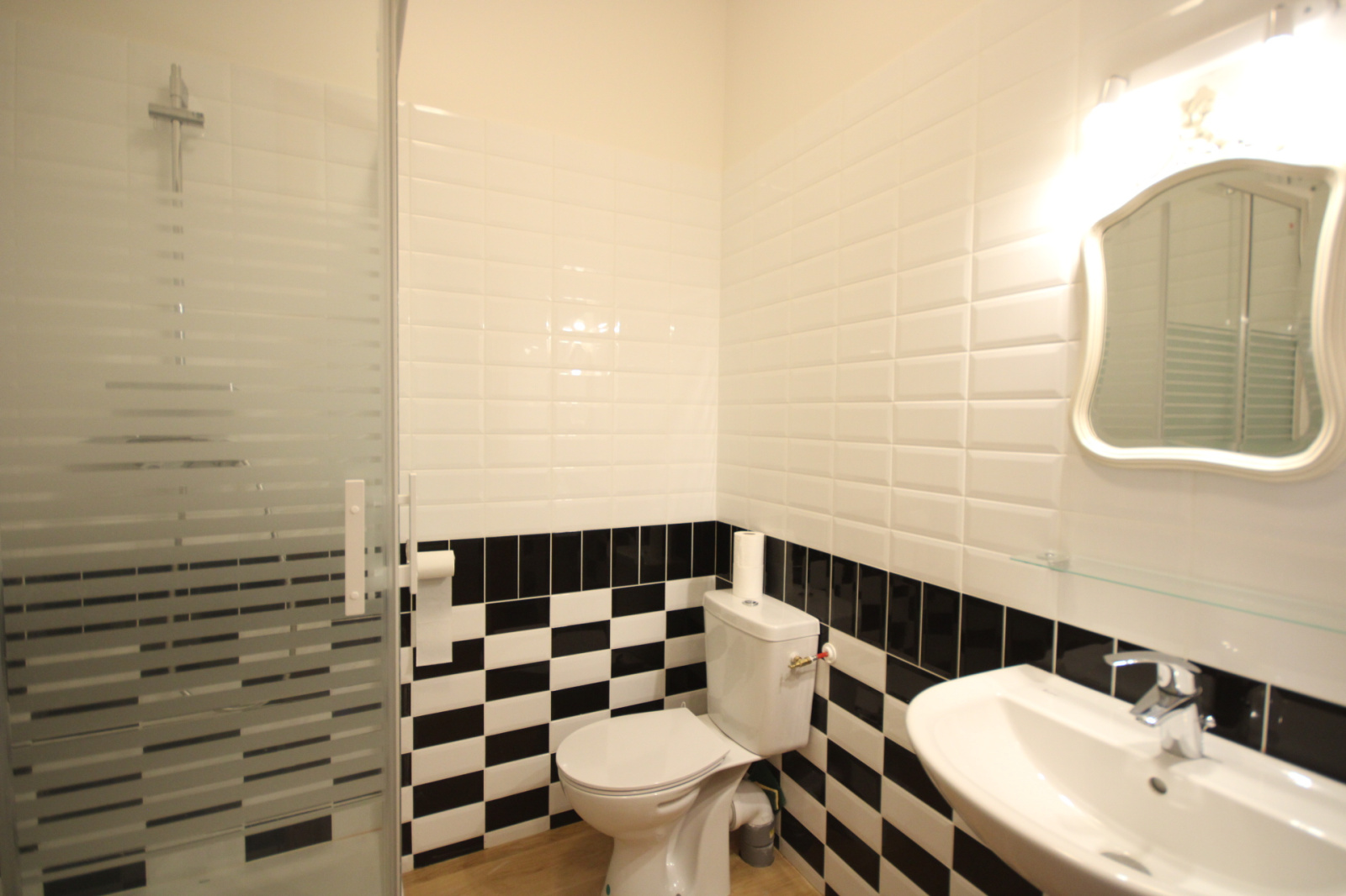 L'appartement se compose de : une entrée, un salon de 29 m², une salle d'eau, une pièce de 31 m², une tour (style échauguette). Au dessus de l'appartement se trouve une magnifique pièce sous toiture de 40 m². Aujourd'hui l'accès se fait indépendamment, mais il est possible de créer un accès direct depuis l'appartement pour créer une belle chambre mansardée de 38 m².