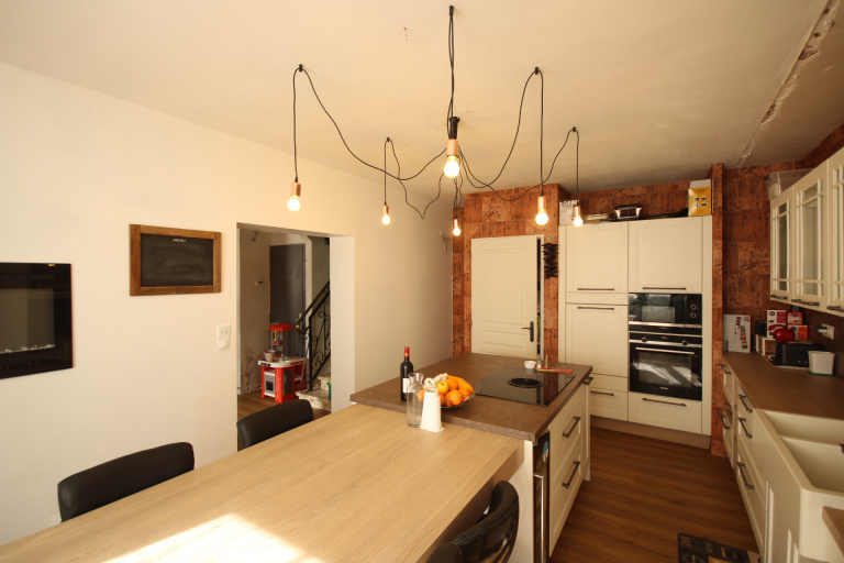 Rez-de-chaussée : hall de 4.80 m2, cuisine équipée de 17.80 m2, salon de 35.50 m2 avec cheminée, buanderie de 2.60 m2, toilettes
