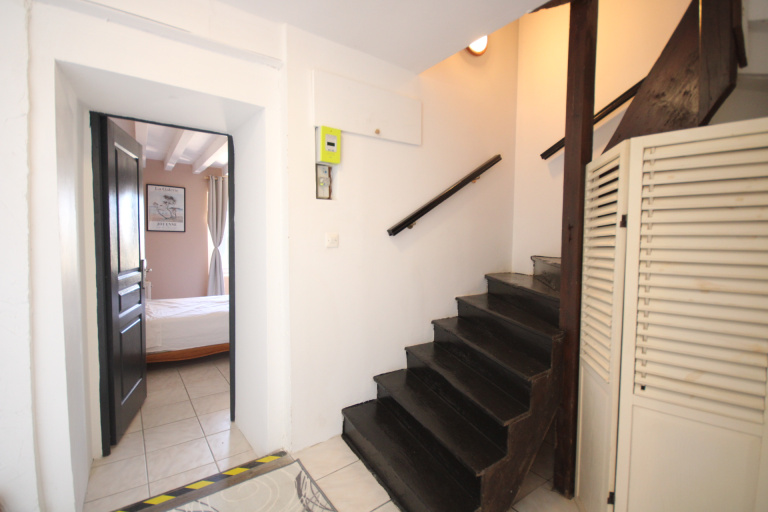 Premier étage : palier, pièce à vivre donnant sur balcon/terrasse, cuisine équipée, 1 chambre, 1 salle de bains avec toilettes.