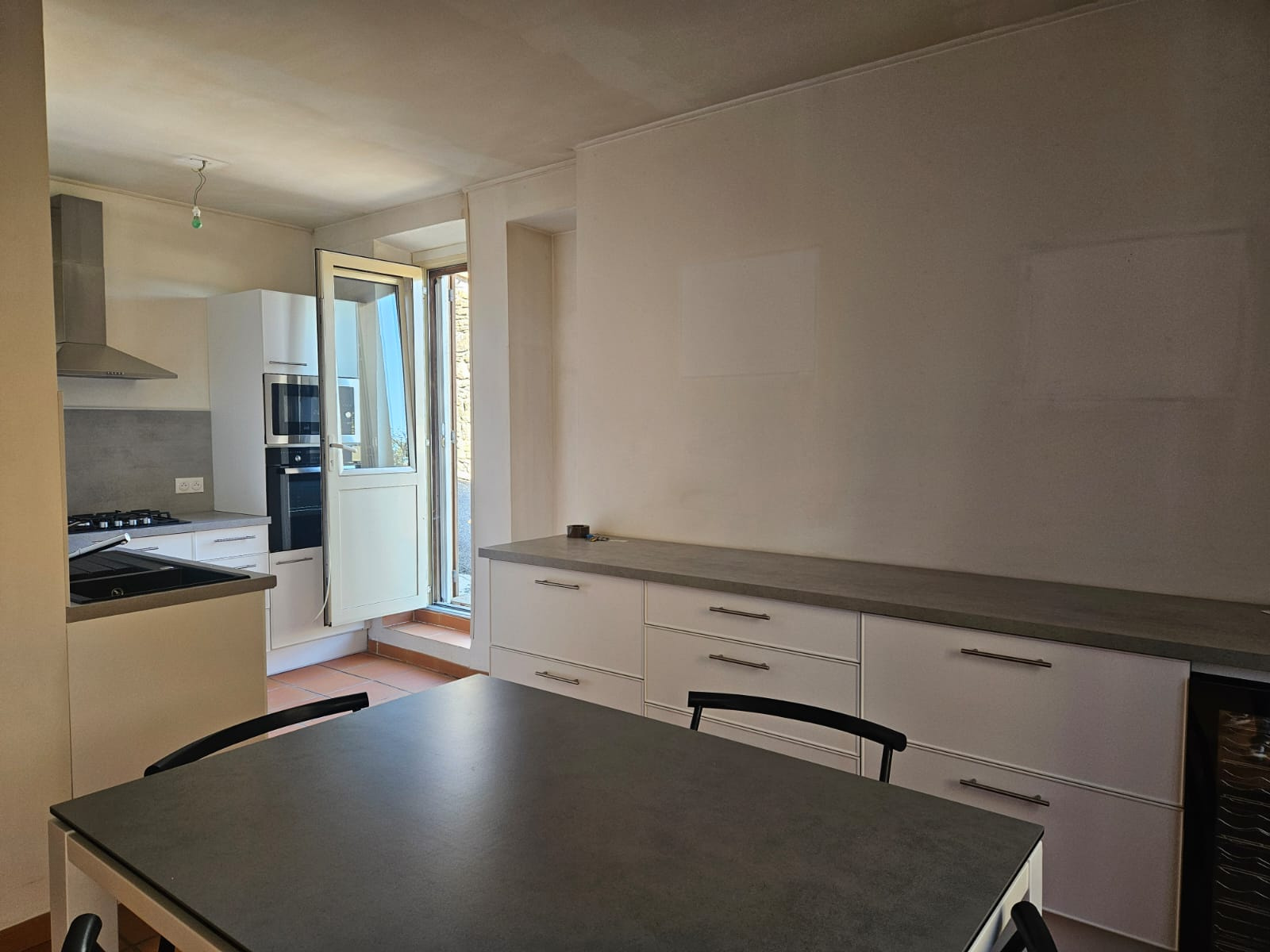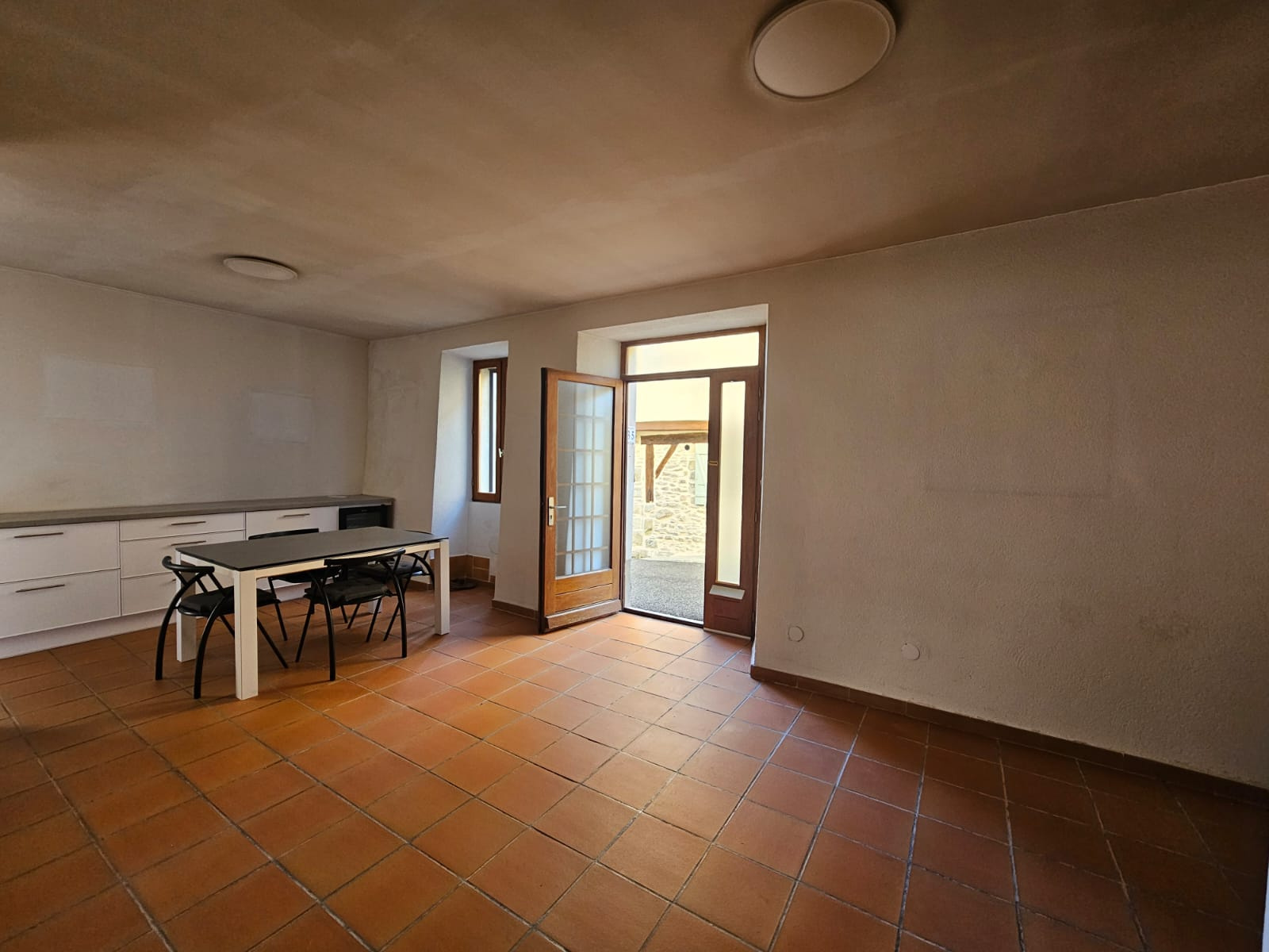 Une pièce à vivre comprenant une cuisine équipée-salle à manger-salon avec cheminée insert, toilettes, cellier.