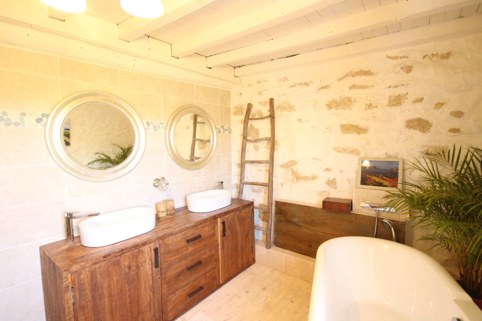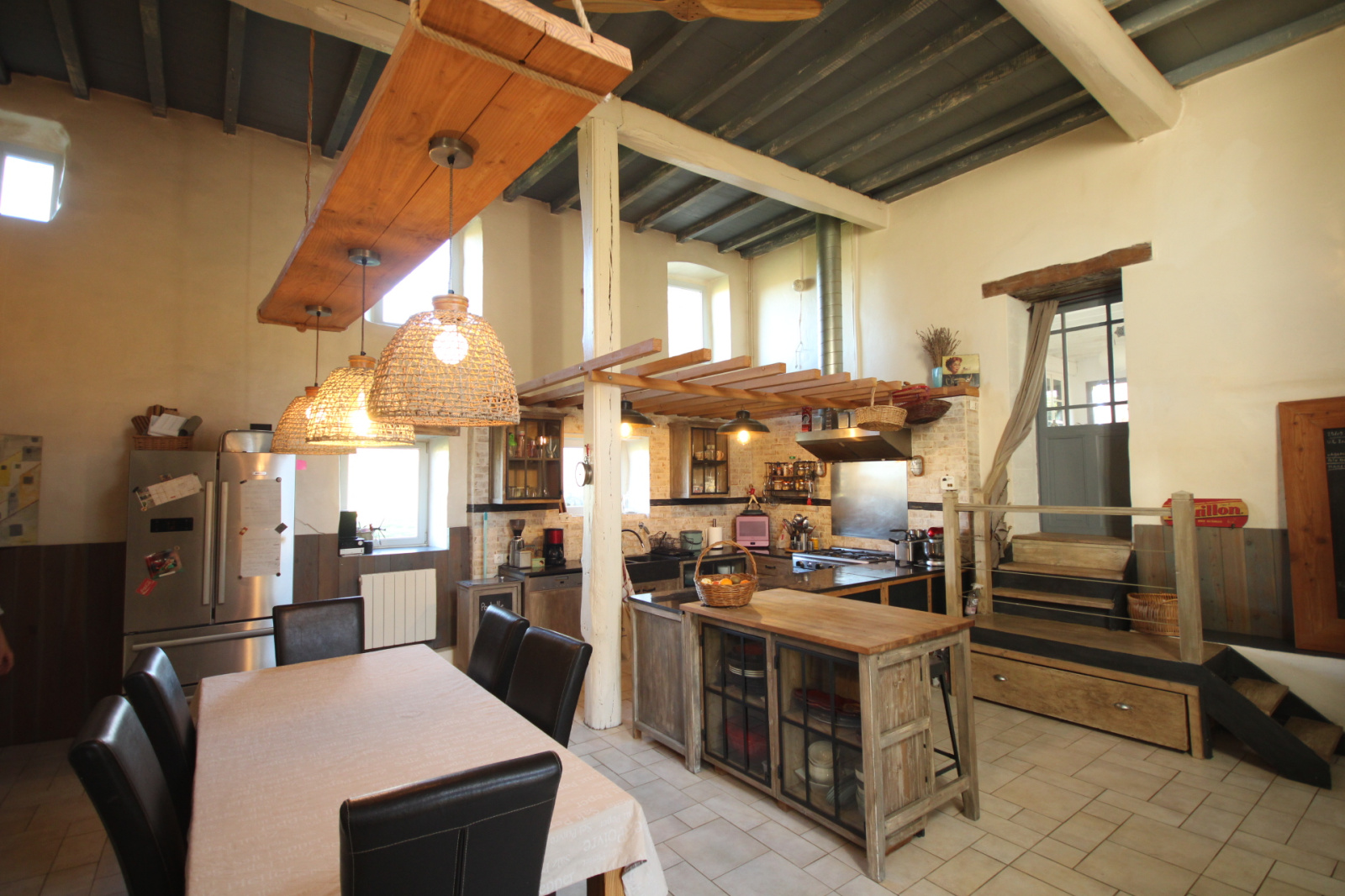 Au rez de chaussée : entrée, 1 cuisine aménagée avec plafond cathédrale 41,40 m², 1 salon de 45 m² avec cheminée ouvert des 2 côtés (cuisine et salon), 1 chambre 10,50 m² + salle d’eau et toilettes, 1 chambre ouest 26m², 2 accés pour l'étage, pièce de détente (bureaux/jeux/ atelier artiste/ sellerie, toilettes) de 96m².