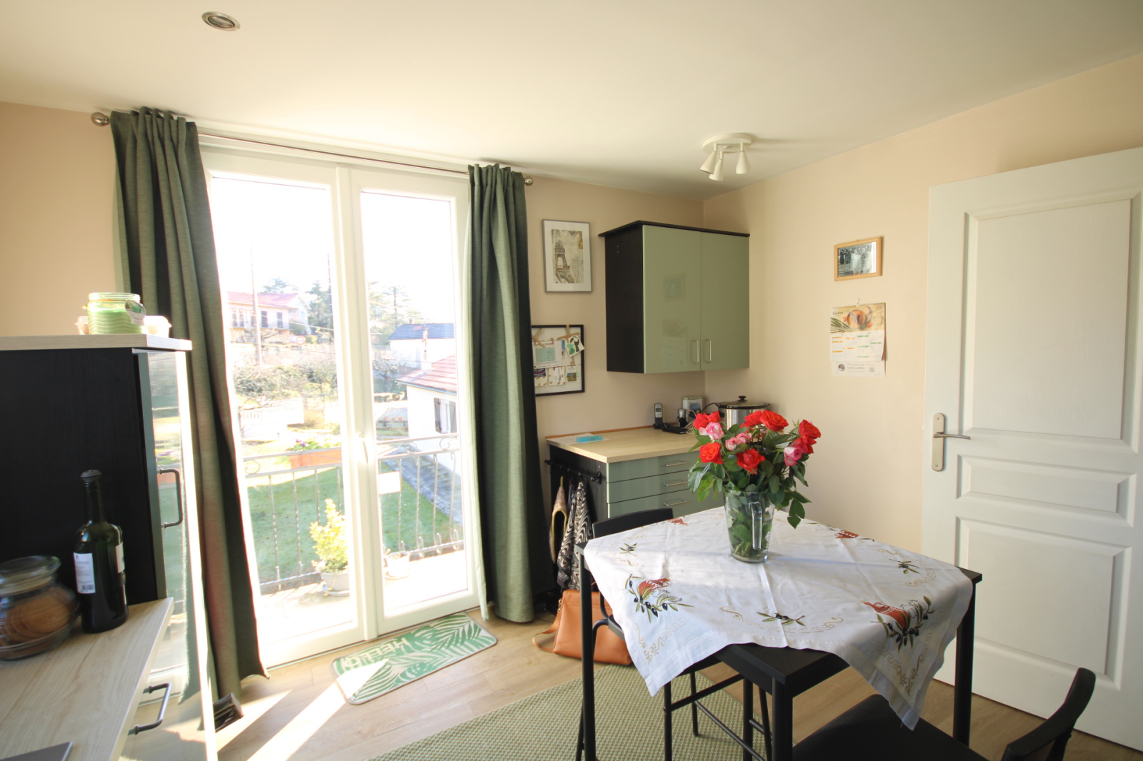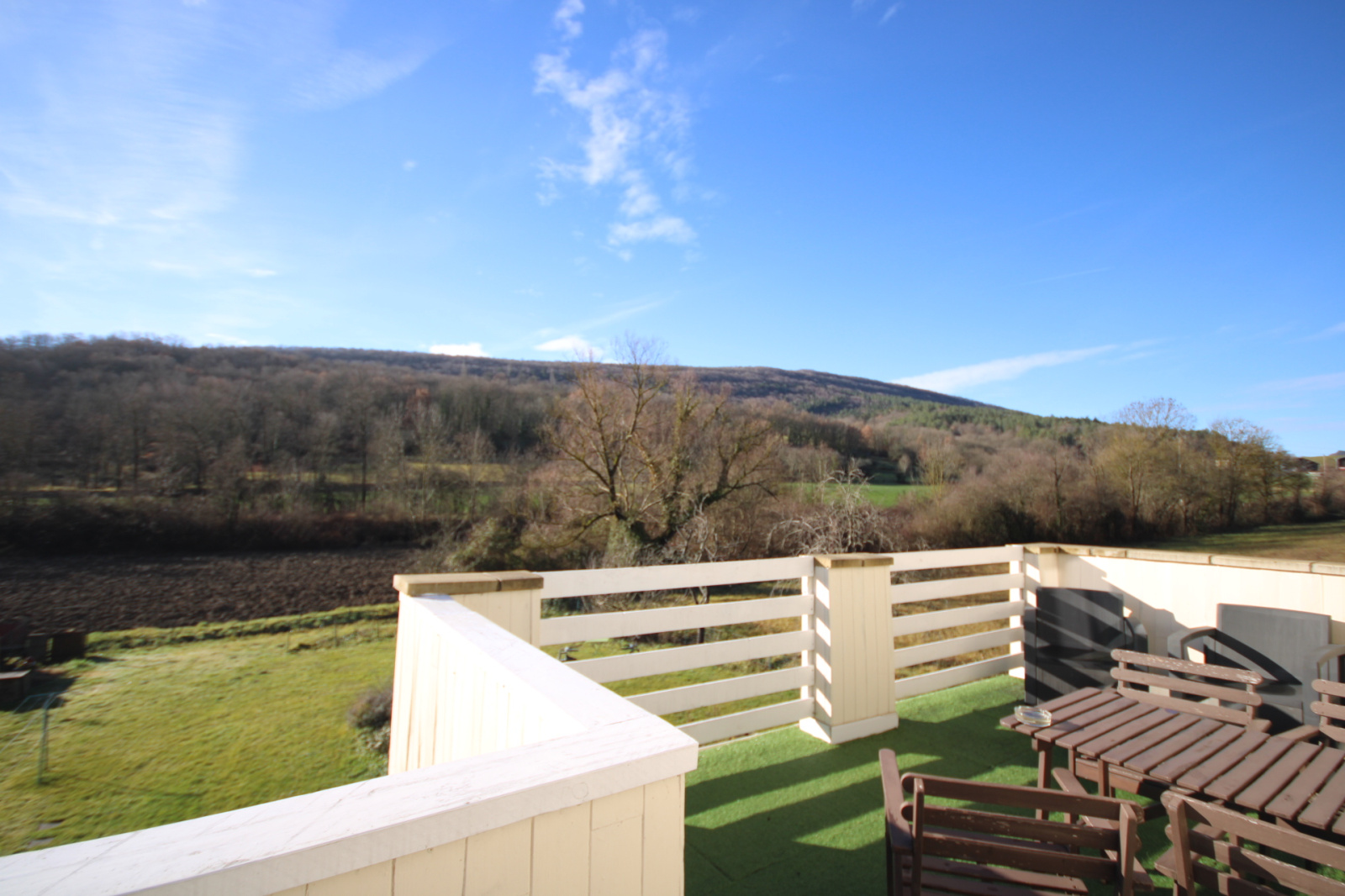 Au 1er étage : palier, salon poele granulés avec accés balcon, 1 cuisine équipée, cellier / buanderie, 1 salle à manger, 1 chambre et 1 salle d'eau avec toilettes