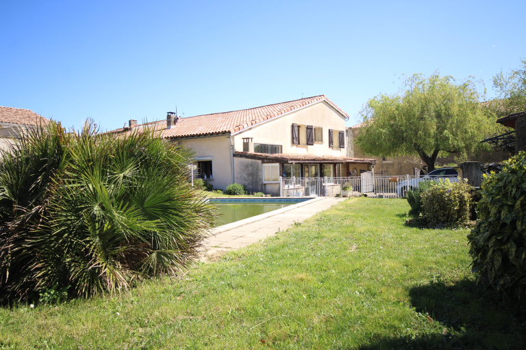Maison mitoyenne sur l’arrière, d’une surface habitable de 224 m2 sur terrain paysagé de 1 061 m2 avec sa piscine 10m x 5m (liner, chauffée, pompe neuve), terrain entièrement clos.