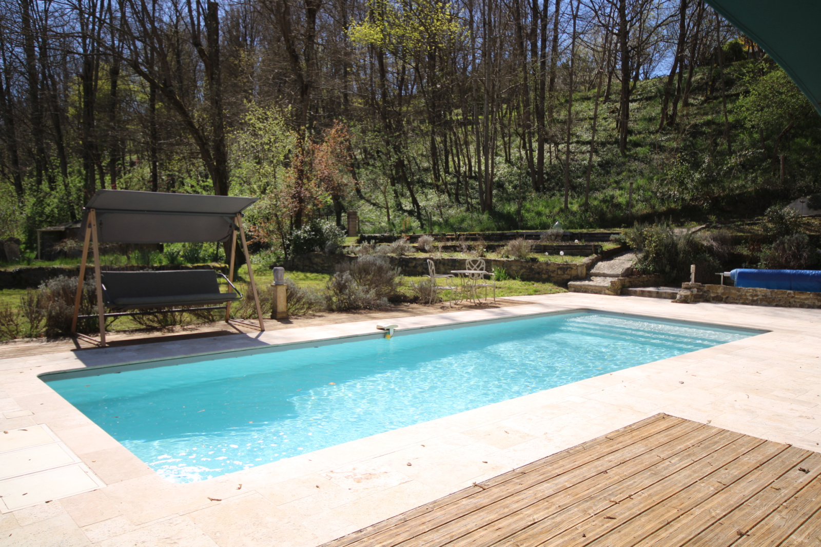 Le terrain s’étale sur 1 ha 21a 95 ca de parc arboré et paysagé et comporte une piscine au sel, chauffée de 10m x 5m.