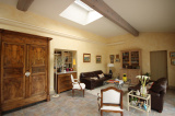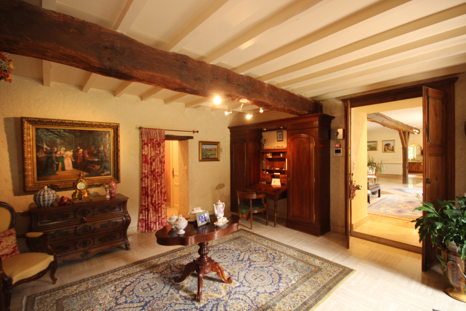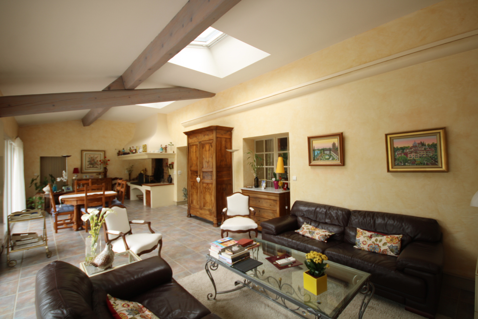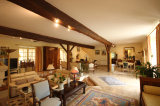 La maison principale : hall, grand séjour/salon avec cheminée, 1 cuisine équipée et salle à manger, buanderie / chaufferie, 1 grande pièce avec salon d’hiver et cheminée barbecue,