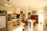 Terrasse englobant la maison, grande entrée, cuisine équipée et salle à manger.