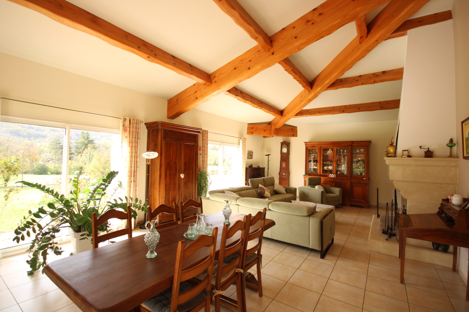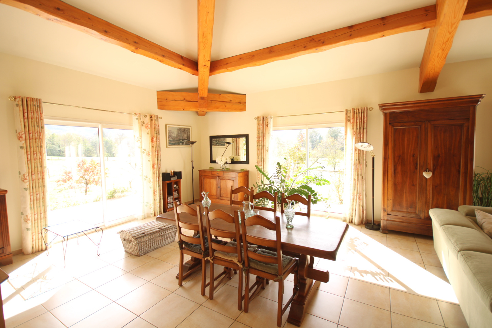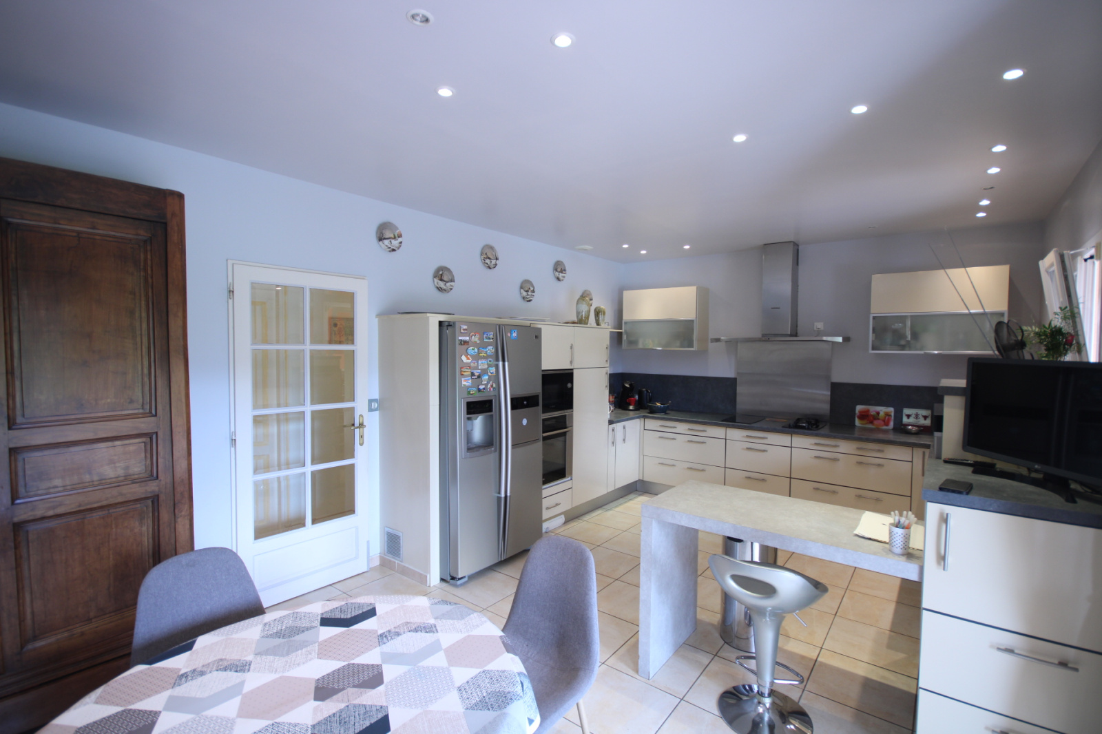 Grande entrée, séjour salon plafond cathédrale avec cheminée et donnant sur terrasse, cuisine équipée et coin repas, chambre parentale avec salle d’eau et dressing, 2 chambres, salle d’eau, toilettes, bureau, buanderie avec accès direct extérieur, garage double et atelier de 80 m²