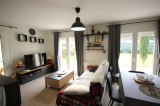 Hall d’entrée,un wc indépendant,une cuisine équipée neuve agrémentée d’une verrière donnant sur un séjour salon agrémenté d’un poêle à bois.La pièce de vie exposée Ouest bénéficie d’un accès direct sur une terrasse couverte ainsi qu’au jardin.